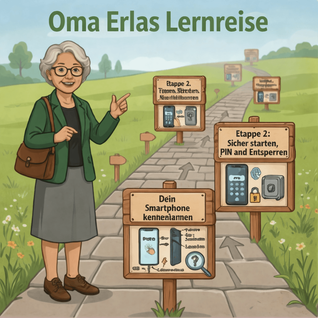 Du kannst mit Oma Erla auf die Lernreise gehen, in der Bibliothek einzelne Themen entdecken oder im Glossar Begriffe nachschlagen.